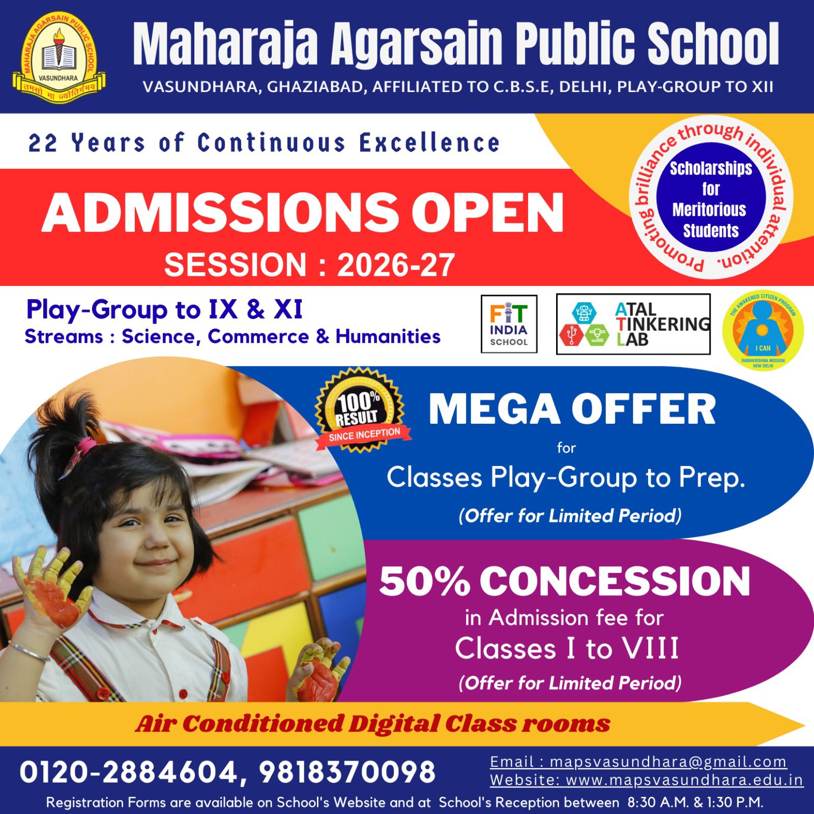 Maharaja Agarsain Public School ,an upcoming and progressive Senior Secondary School,affiliated to CBSE,is situated at Sector -13,Vasundhara,Ghaziabad. It is a campus with lush green surroundings and the capacity to accumulate large numbers of students. It has been founded by the Maharaja Agarsain Educational Society,Ghaziabad in the year 2003.